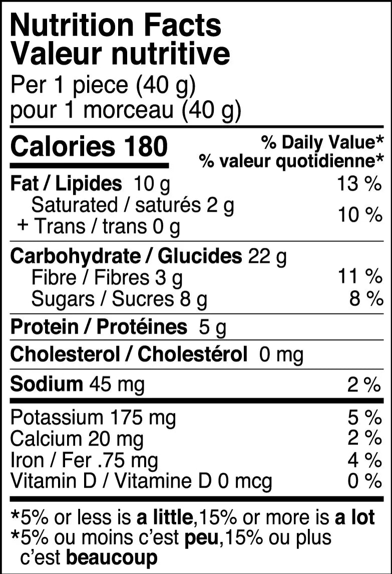Ingrédients : Flocons d’avoine sans gluten*, Beurre d’arachide* (arachides*), Sucres* (miel*, sirop de tapioca*), Brisures de chocolat*† (sucre de canne*, pâte de cacao*, beurre de cacao*), Arachides*, Noix de coco*, Café*†, Sel de mer. *Biologique. †Commerce équitable.