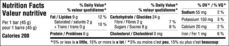 Ingrédients : Flocons d’avoine sans gluten*, Beurre d’arachides*, Sucres* (miel*, sirop de tapioca*), Arachides*, Framboises déshydratées*, Sel de mer. *Biologique.